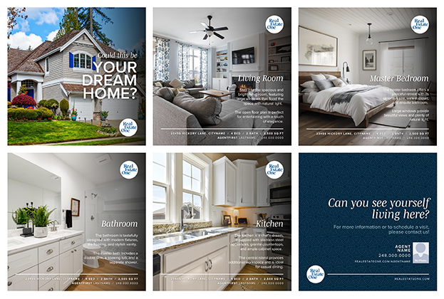 Drop in your listed home photos with descriptions onto the separate pages in this template. Modify all text to fit your needs. Then download as a MP4 video set to music to post to your social sites.