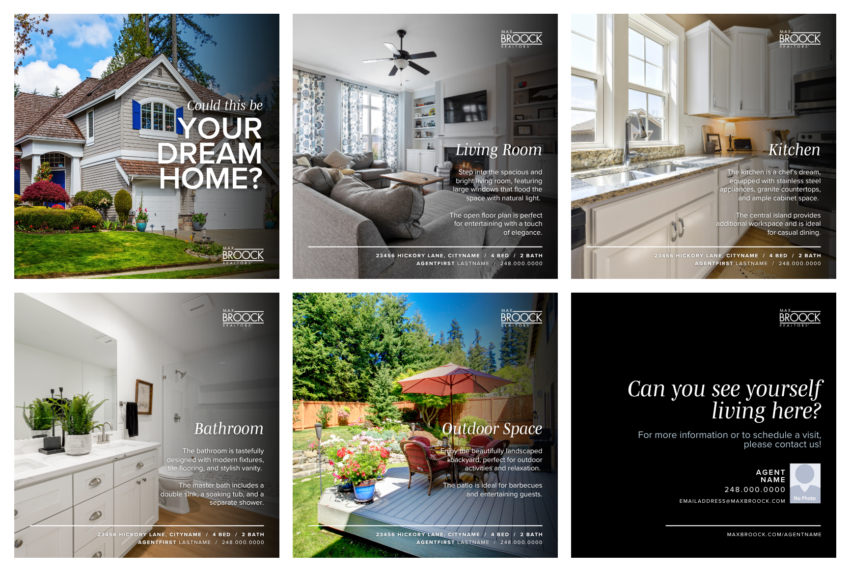 Drop in your listed home photos with descriptions onto the separate pages in this template. Modify all text to fit your needs. Then download as a MP4 video set to music to post to your social sites.