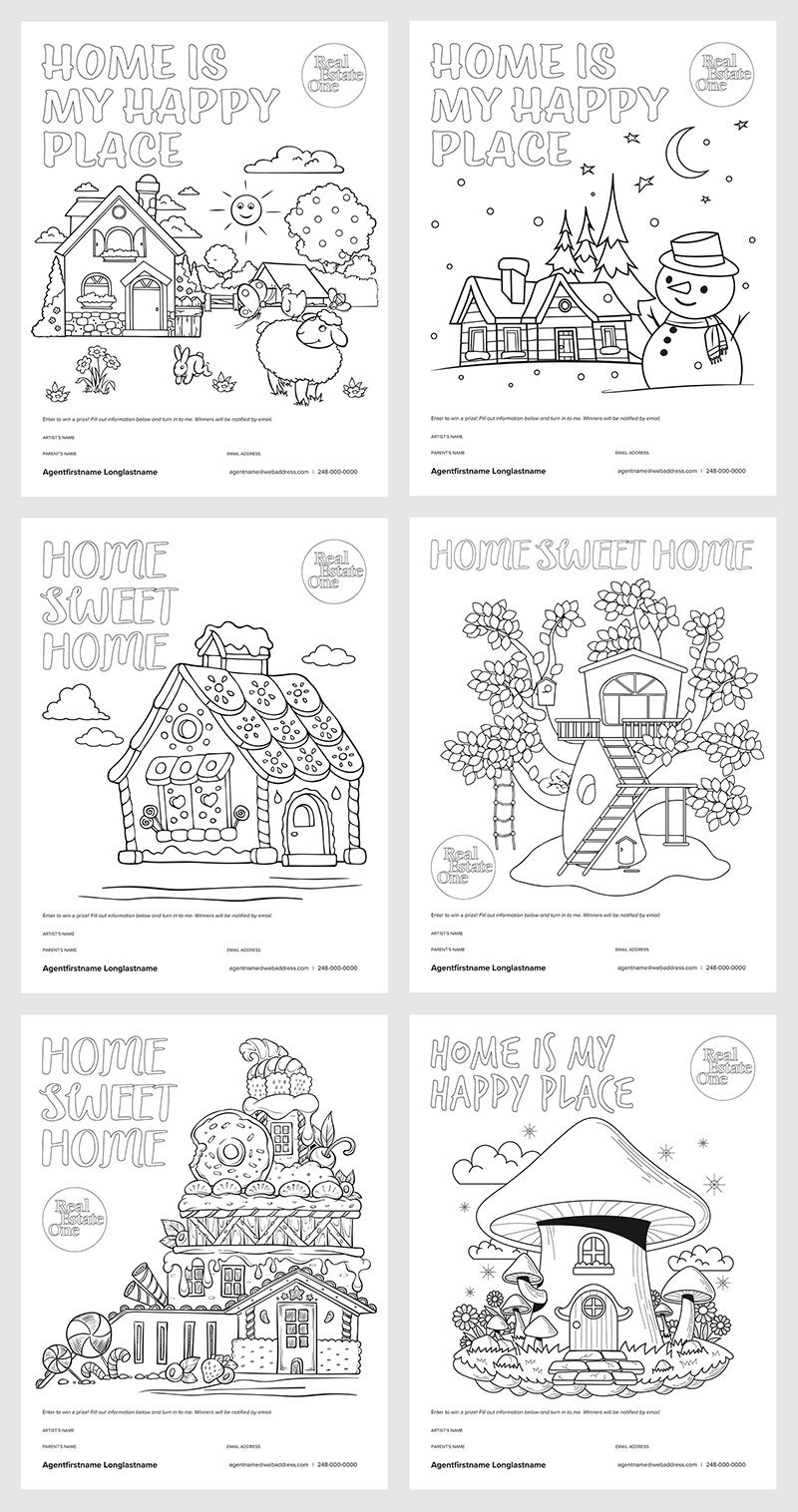 Print out this set of coloring pages to keep the kids occupied during open houses. Have the parents enter the contact information to enter to win a prize.